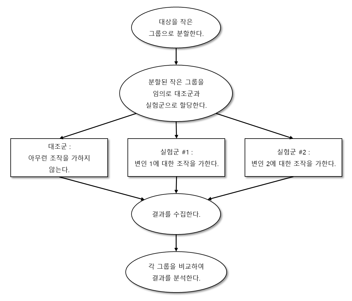 - 모집단을 대표하는 표본집단을 (임의) 추출하고 임의로 그룹 배정하여 일반화가 가능하도록 실험하는 것