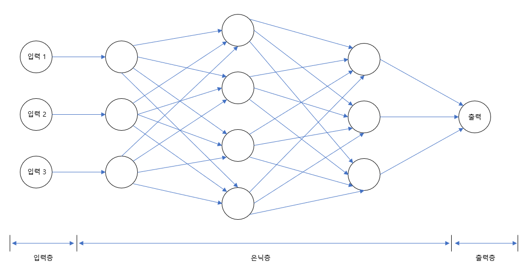 입력층에서 입력 변수를 받으며, 가운데 은닉층은 입력층 변수를 처리하고 출력층으로 전달한다. 출력층은 목표 변수에 대응하는 곳으로 최종 예측 값을 낸다.
