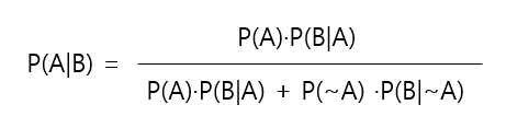 - P(~A) : 사건 A에 대한 여사건의 사전 확률 (이미 발생했던 결과에 대하여 사건 A가 발생하지 않을 확률)
