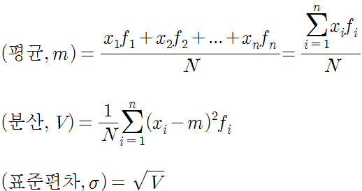 분산은 관측값에서 평균을 뺀 값을 제곱하고, 그것을 모두 더한 후 전체 개수로 나눠서 구한다.