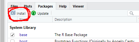 RStudio 우측 하단 창에서 'Packages'탭을 선택한다. 'install' 버튼을 클릭한다.