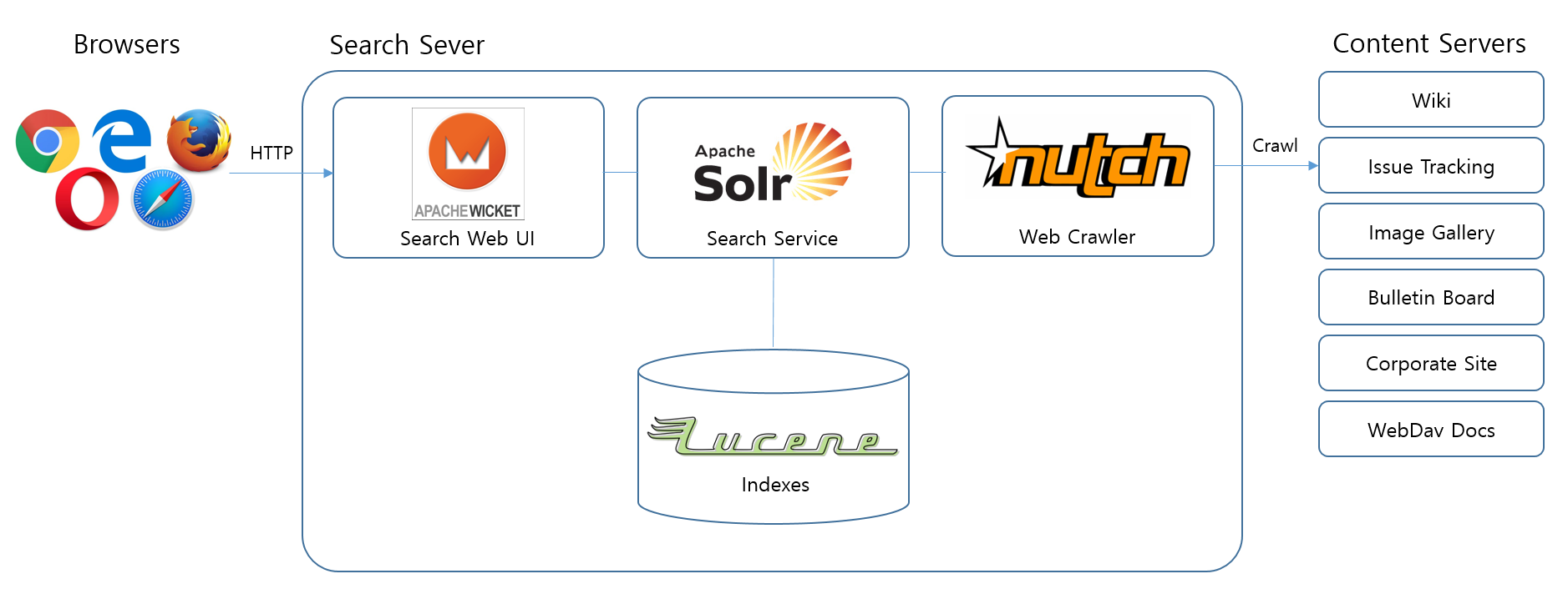 너치(Apache Nutch) 루씬을 기반으로 하여 만든 오픈 소스 검색 엔진이다. 루씬을 기반으로 하였지만 웹 크롤러는 처음부터 다시 만들었다. 여러 가지 플러그인을 붙일 수 있도록 모듈화가 잘 되어 있다. 현재 아파치의 하위 프로젝트이다.