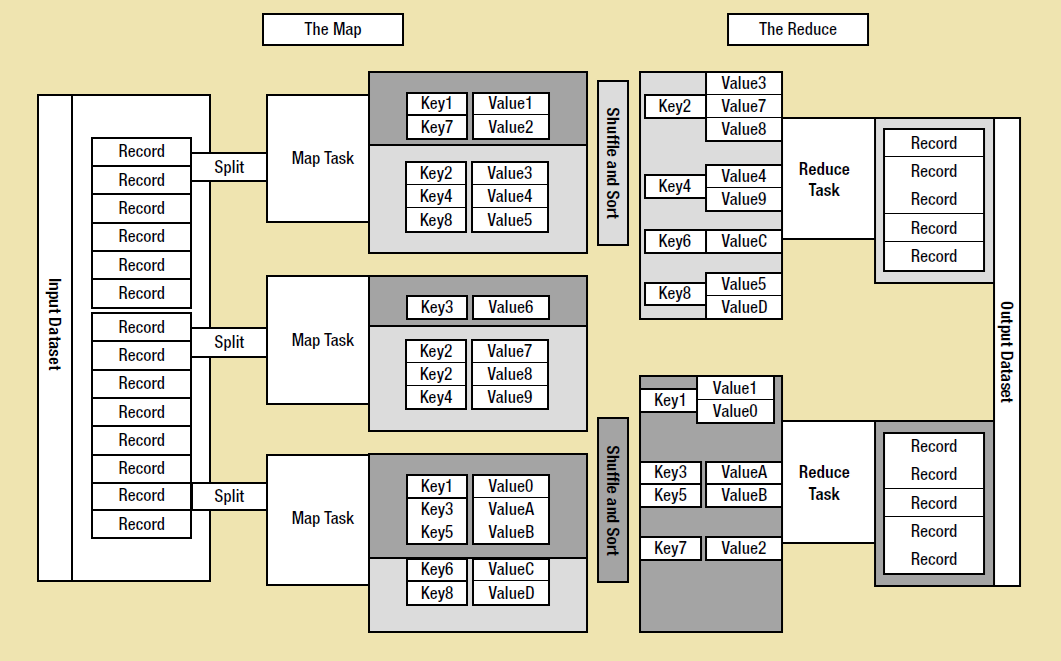 - Reduce : Map에서 입력받은 정형화된 키/값 쌍을 실제 병렬 처리하는 모듈