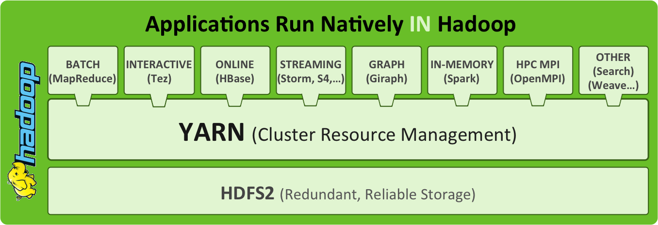 | 호환성 | MapReduce만 수행 | MapReduce 외의 다른 분산 시스템 지원(STORM, HANA, GIRAPH 등) |
