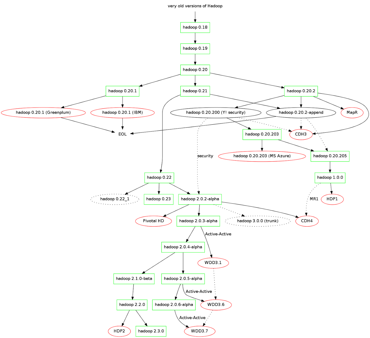 하둡은 0.x로 시작된 개발용 버전에서 출발하여, 0.18 → 0.19 → 0.20 → 0.20.2 → 0.20.205 → 1.0 순서로 발전한 1.X의 버전과 0.23 버전에 YARN(Yet Another Resource Negotiator) 아키텍처가 추가되어 발전한 2.x 버전으로 나뉜다.