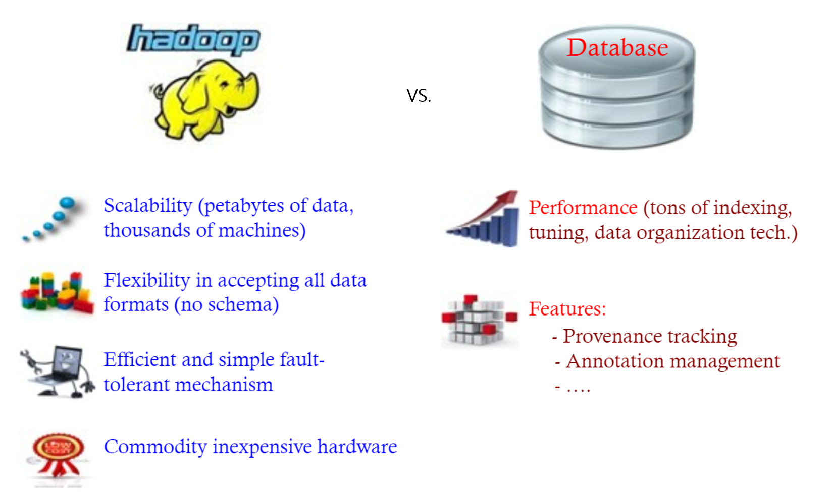 하둡(Apache Hadoop, High-Availability Distributed Object-Oriented Platform)은 데이터가 늘어날 수록 대용량 저장소와 빠른 처리를 위한 고성능을 요구하는 수직적 확장방식의 중앙집중식이 아니라, 다수의 범용 컴퓨터들로 분산하여 저장하고 처리하는 수평적 확장방식의 분산처리 플랫폼이다.