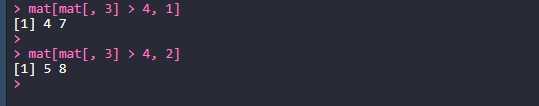 > mat[mat[, 3] > 4, 2] # 3열에서 4보다 큰 행의 값 중 2열의 모든 값