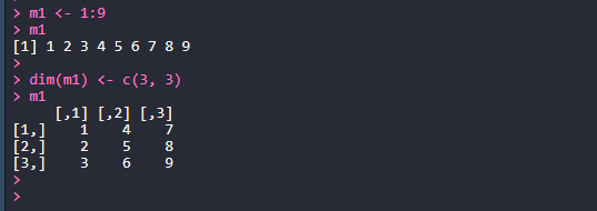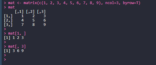 > mat <- matrix(c(1, 2, 3, 4, 5, 6, 7, 8, 9), ncol=3, byrow=T)