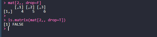 > is.matrix(mat[2,, drop=F]) # mat[2,, drop=F] 행령인지 확인