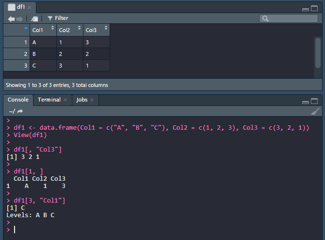 > df1 <- data.frame(Col1 = c("A", "B", "C"), Col2 = c(1, 2, 3), Col3 = c(3, 2, 1))