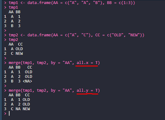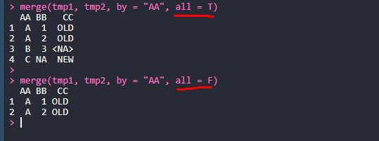 > merge(tmp1, tmp2, by = "AA", all = F)