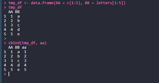 > tmp_df <- data.frame(AA = c(1:5), BB = letters[1:5])