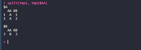 > tmp1 <- data.frame(AA = c("A", "A", "B"), BB = c(1:3))