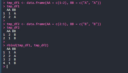 > tmp_df2 <- data.frame(AA = c(2:1), BB = c("B", "B"))