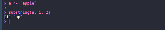 > substring(a, 1, 2) # a의 첫 번쨰 자리부터 두 번째 인덱스까지