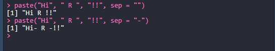 > paste("Hi", " R ", "!!", sep = "-")