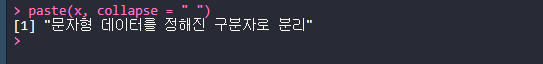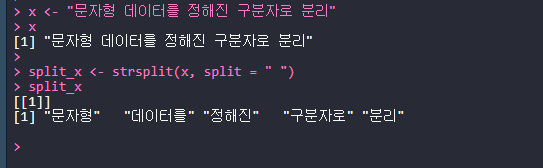 > x <- c("문자형", "데이터를", "정해진", "구분자로", "분리")