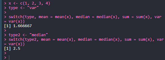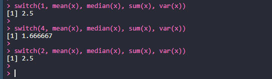 > switch(type, mean = mean(x), median = median(x), sum = sum(x), var = var(x))