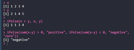 > ifelse(sum(x-y) > 0, "positive", ifelse(sum(x-y) < 0, "negative", "zero"))