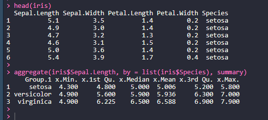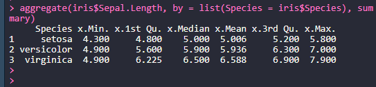 > aggregate(iris$Sepal.Length, by = list(Species = iris$Species), summary)