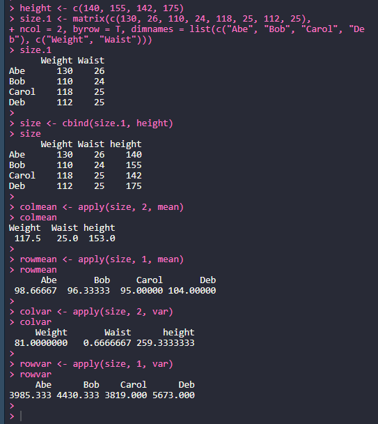 + ncol = 2, byrow = T, dimnames = list(c("Abe", "Bob", "Carol", "Deb"), c("Weight", "Waist")))