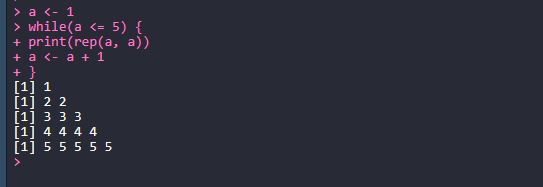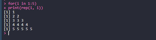 # 변수 i가 1에서 5까지의 값을 갖을 때까지 print(rep(i, i))라는 실행문을 실행한다.