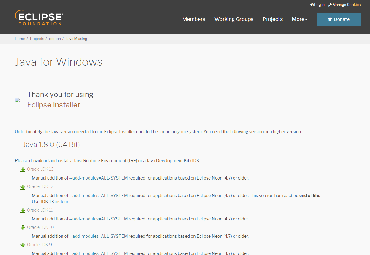 JDK 를 다운로드 받아서 설치하고, 환경변수 설정까지 마쳤는데도 불구하고, 다운로드 받은 eclipse install 파일을 실행하면 이런 웹페이지가 나타나는 경우가 있다.