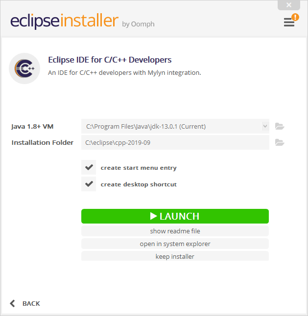 실치가 완료되고 installer의 'LAUNCH' 버튼을 클릭하니 이클립스 실행된다.