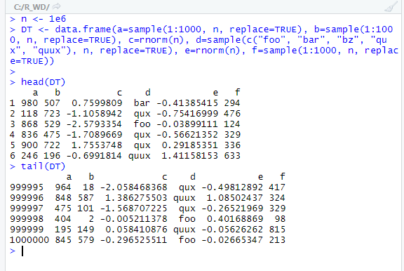 파일에서 데이터를 가져오는 것에 이어서 파일에 데이터를 저장하는 것도 살펴보자. 데이터 Export 파일에 데이터를 저장하는 방법들 중 wrtite.table, write.csv 함수에 대해서 살펴보자. 우선 Export 하는데 이용할 데이터를 생성하고, 생성된 데이터를 파일로 저장하는 순서로 진행한다. # 샘플데이터 생성 # 난수 생성기의 seed 값 > n DT head(DT) #tail 함수로 DT에 있는 데이터의 뒤 몇개 데이터 조회 > tail(DT) write.csv() # write.csv() 함수로 CSV 파일에 저장하기 # DT의 데이터를 'out_test.csv' 파일에 저장한다. > write.csv(DT, "C:\\R_WD\\out_test.csv", sep=",", row.name..