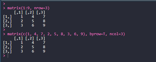 행렬(Matrix) 행렬(Matrix)은 동일한 형으로 구성된 2차원이 데이터 구조이다. 행의 차원과 열의 차원을 갖는 행렬은 수학에서의 행렬과는 달리 문자형이나 논리형 등을 원소로 사용할 수 있다. 그러나, 행렬의 원소는 한가지 형의 자료로만 구성되어야 한다. matrix( ) # 행렬(matrix)는 여러 변수들이 이차원적으로 모여 있는 개체로, 행렬을 생성하기 위해서는 matrix() 함수를 사용한다. > matrix(1:9, nrow=3) # nrow : 행의 개수 지정 # ncol : 열의 개수 지정, byrow=T : 행 기준 행렬을 생성 > matrix(c(1, 4, 7, 2, 5, 8, 3, 6, 9), byrow=T, ncol=3) 행렬에서의 데이터 추출 > mat mat[1, ] # 행..
